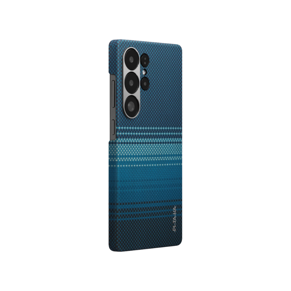Husă Pitaka Aaron Button Edge pentru Samsung S26 Ultra — design ultra-subțire și rigid, construită din fibră aramidică premium, oferă protecție rezistentă la zgârieturi și uzură, cu decupaje precise și compatibilitate cu încărcare wireless.